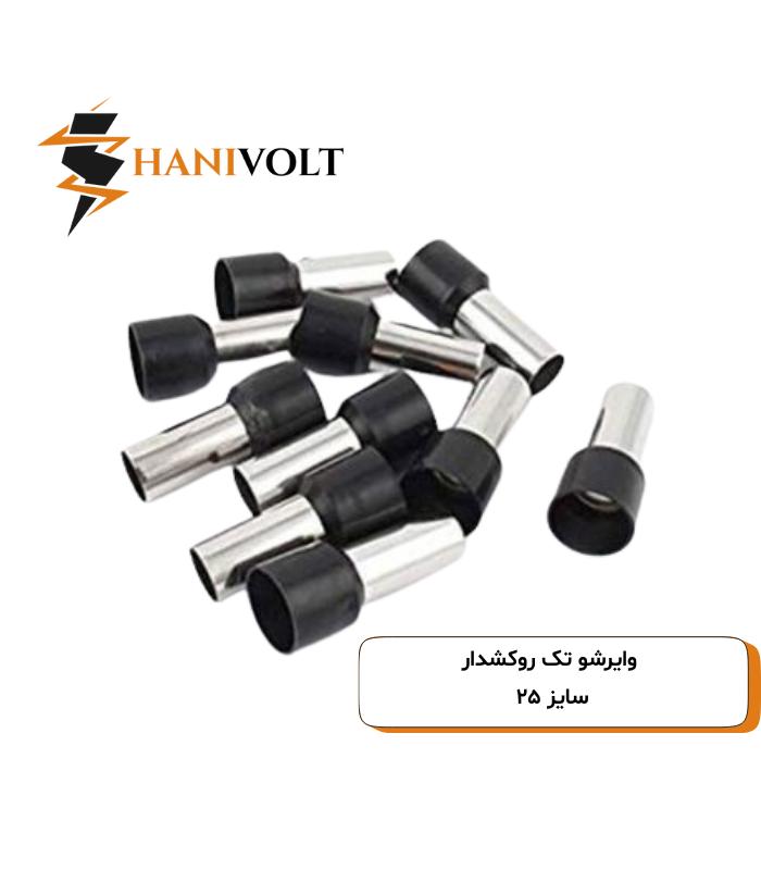 در صنعت از وایرشو تکی سایز 25 جهت انصال سیم به ترمینال استفاده می شود.یکی از مهمترین علت های استفاده از وایرشو این می باشد که اگر جهت اتصال سیم به ترمینال از وایرشو استفاده نشود ممکن است سیم دچار له شدگی , قطعی شدن و یا عدم اتصال درست سیم و جدا شدن سر سیم از داخل ترمینال و یا محل اتضال 25 نام برد. امروزه استفاده از وایرشو تکی سایز 25 یکی از مهمترین نکات ایمنی در تجهیزات تابلوهای برق می باشد.وایرشو سایز با روکش پلاستیکی سفید رنگ، دارای ورودی یکرشته سیم بوده و همانطور که مشخص می باشد این نوع وایرشو مناسب سیم هایی با سطح مقطع 25 می باشد. جنس وایرشو از مس الکترولیتیک با خلوص بیش از 99.95% با آبکاری قلع از جنس پلیوینلکلراید بدون هالوژن است.